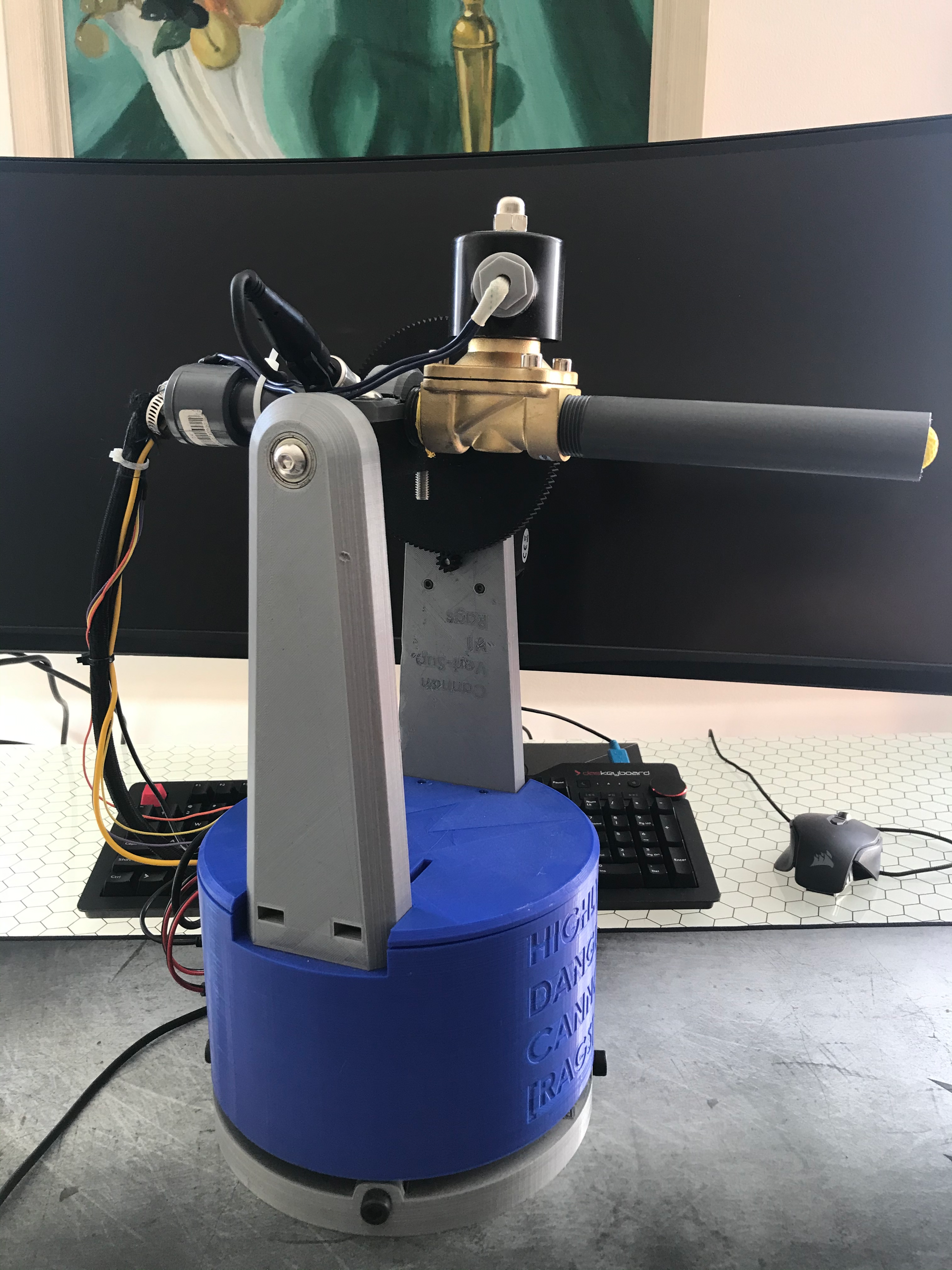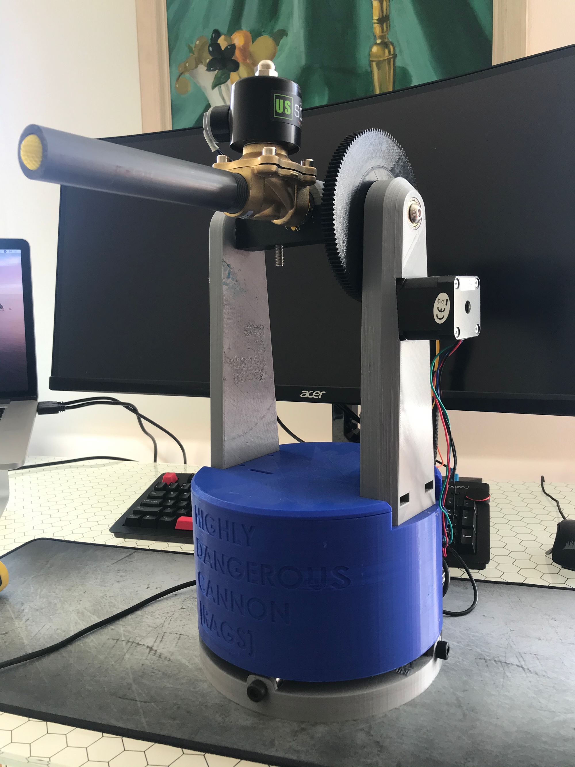My senior year of college I had far too much time on my hands and decided to build an automated cannon on a gimbal with the eventual goal of mounting a camera to it and having automated face tracking and blasting. The camera/tracking step never ended up happening but here’s an overview of the cannon itself.