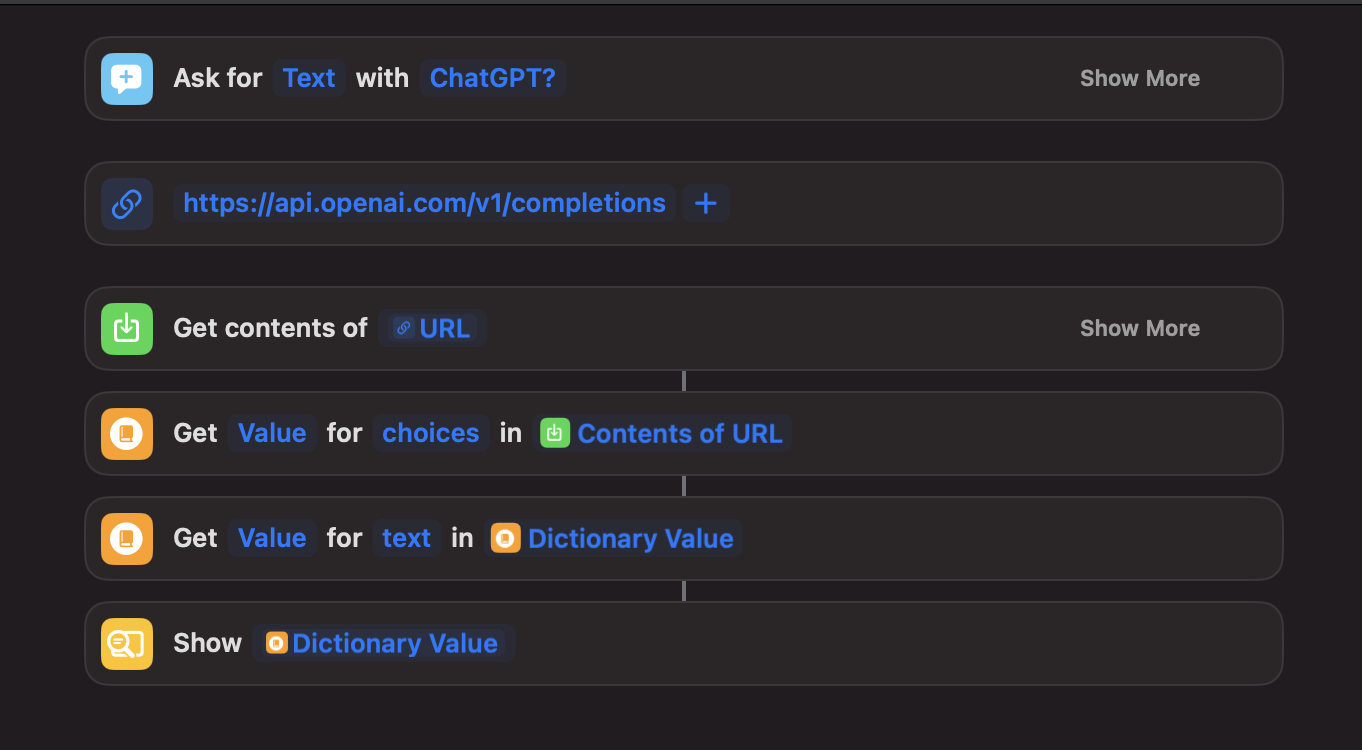 To conclude this experiment: A Shortcuts version of ChatGPT is strictly worse than a homescreen bookmark to chat.openai.com. I'm excited to see the formation of novel interfaces around modern LLMs. I suspect they'll bear minimal resemblance to their predecessors.
